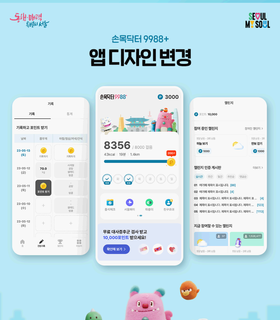 반응형손목닥터9988+가 새롭게 업데이트됩니다! 이 앱은 서울시민 누구나 쉽게 자신의 건강을 관리하고, 더 나아가 건강한 습관을 형성할 수 있도록 돕는 건강증진 지원 서비스입니다.