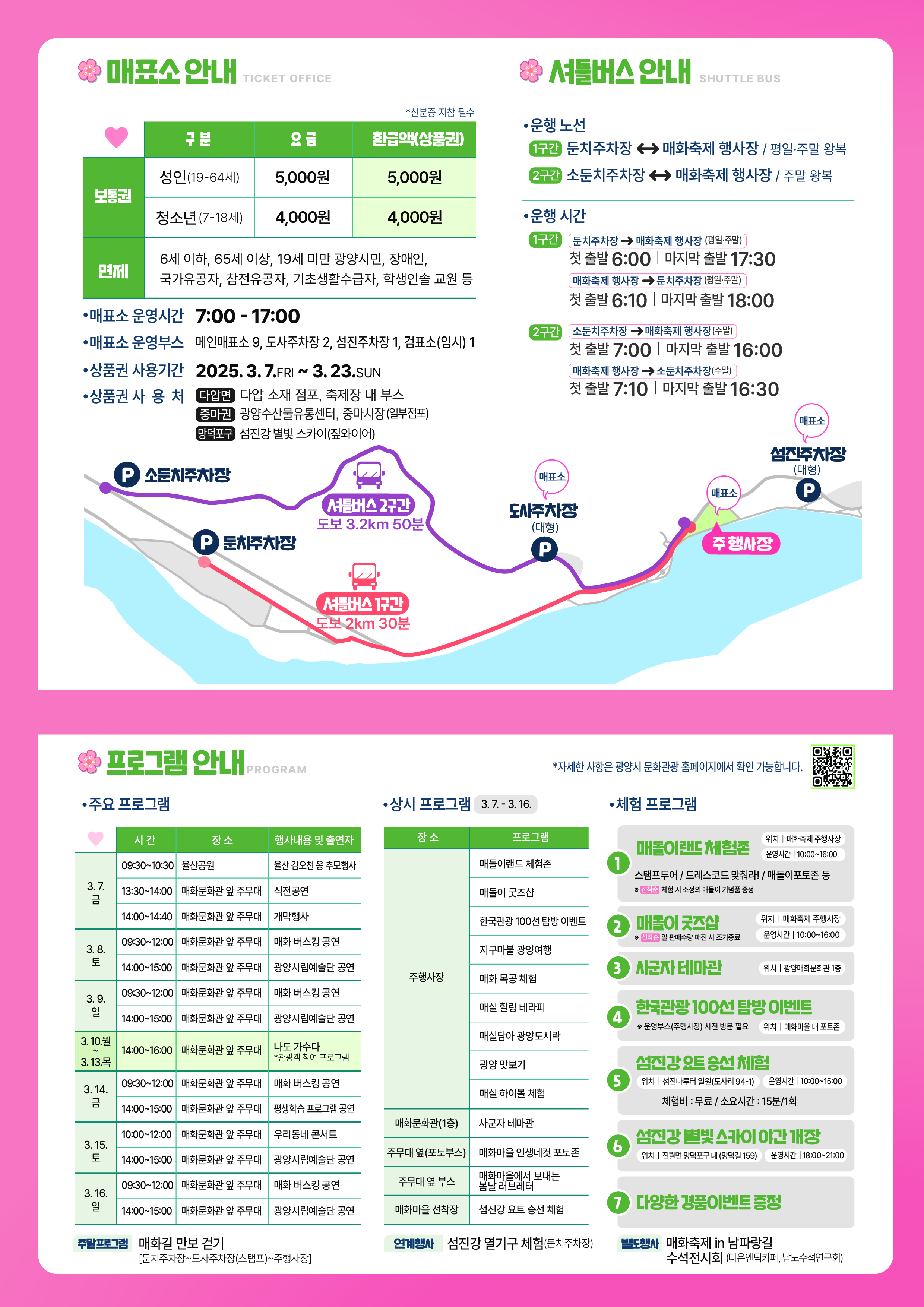 광양매화축제는 유료 입장제로 운영됩니다. 하지만 입장료는 축제상품권으로 환급되기 때문에 사실상 입장료 부담이 없습니다.