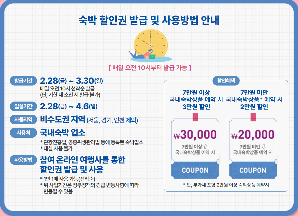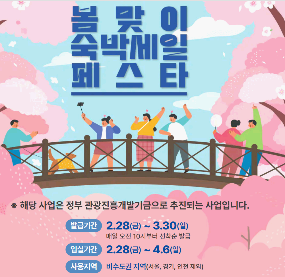 3월 여행가는 달에 맞춰 30만 장의 숙박 할인권이 제공되며, 이를 통해 숙박비를 최대 3만 원까지 할인받을 수 있습니다. 할인권은 2월 28일부터 4월 6일까지 유효하며, 선착순으로 제공되니 예약 전 할인권을 꼭 확인하세요.