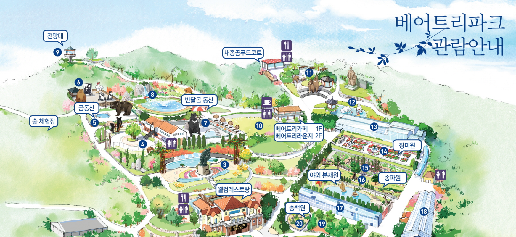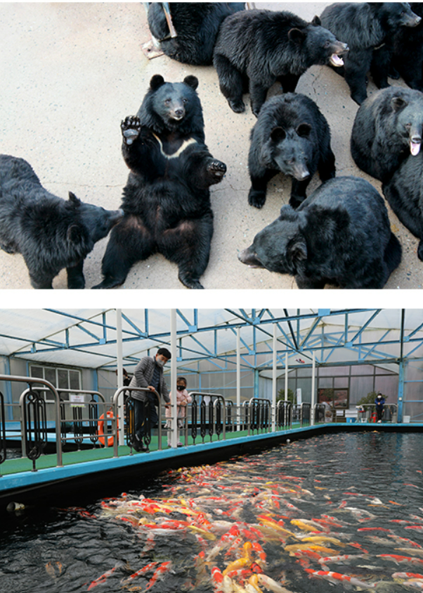 10만여 평의 드넓은 대지 위에 백여 마리의 반달곰과 불곰은 물론, 공작, 꽃사슴 등 다양한 동물들이 자유롭게 뛰노는 모습을 볼 수 있어요. 게다가 1000여 종, 40만 여점에 이르는 꽃과 나무들이 즐비하게 늘어서 있어 사계절 내내 아름다운 풍경을 자랑한답니다.