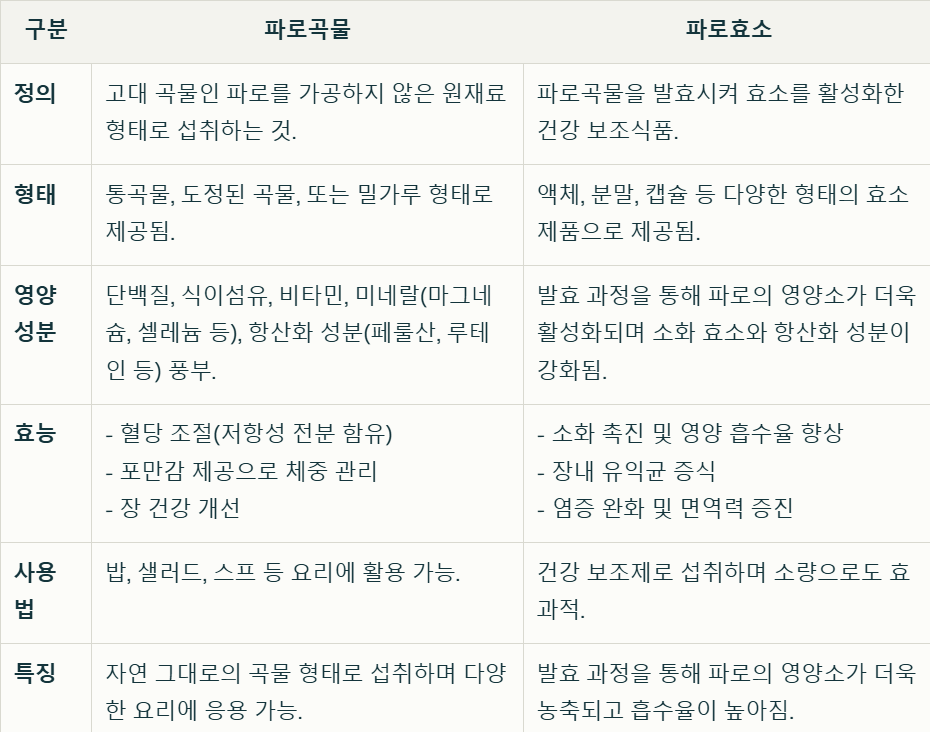 반응형파로곡물과 파로효소는 모두 '파로(Farro)'라는 고대 곡물을 기반으로 하지만, 그 형태와 사용 목적, 효능에서 차이가 있습니다. 아래에서 두 가지를 비교해보겠습니다.