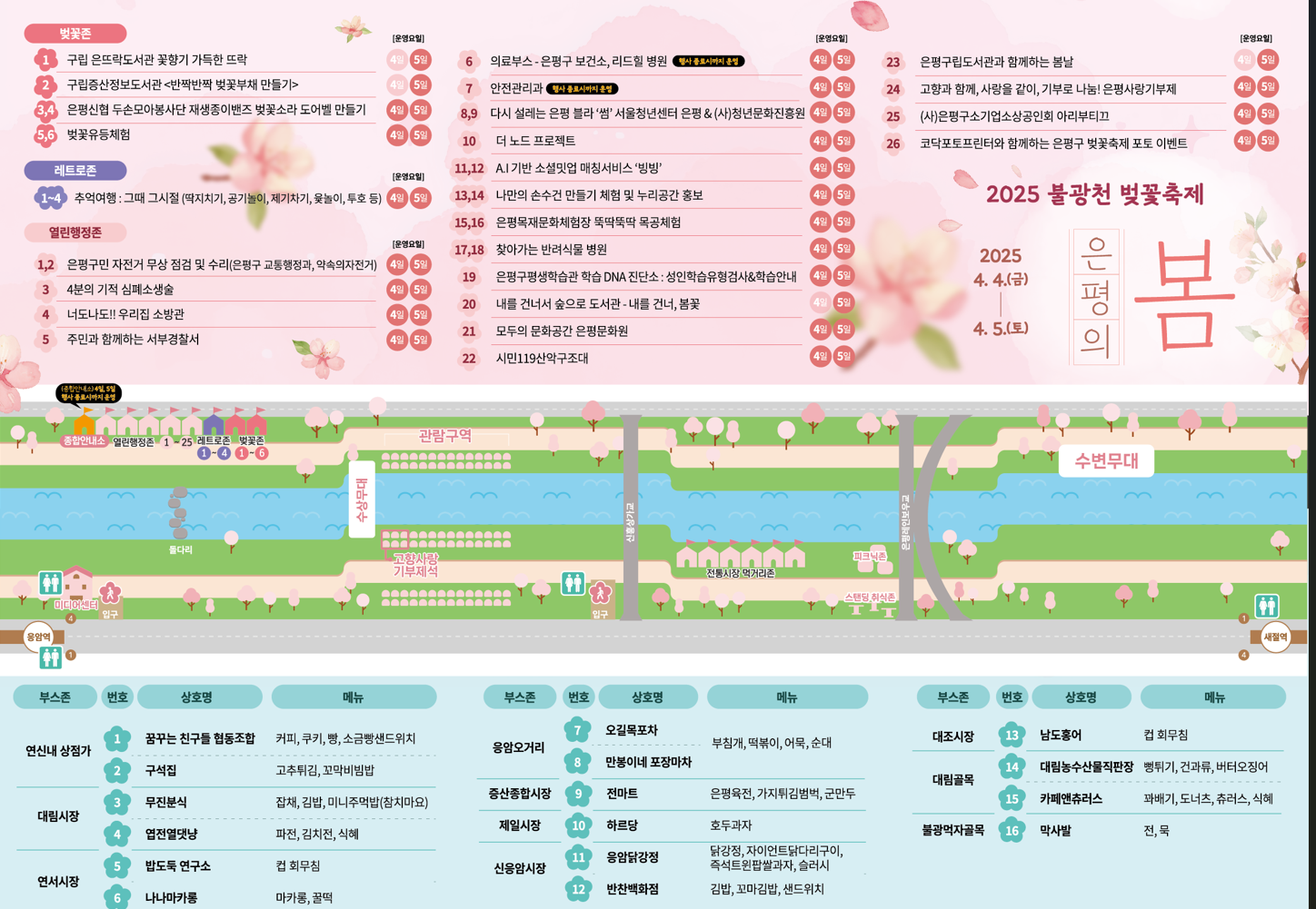응암역에서 새절역까지 이어지는 불광천 산책로는 벚꽃이 흐드러지게 피어 있는 산책 명소로, 축제 기간 동안 테마별 부스가 함께 운영되어 걷는 즐거움이 더욱 커집니다.• 벚꽃 존: 아름다운 벚꽃을 배경으로 인생샷을 찍을 수 있는 포토존