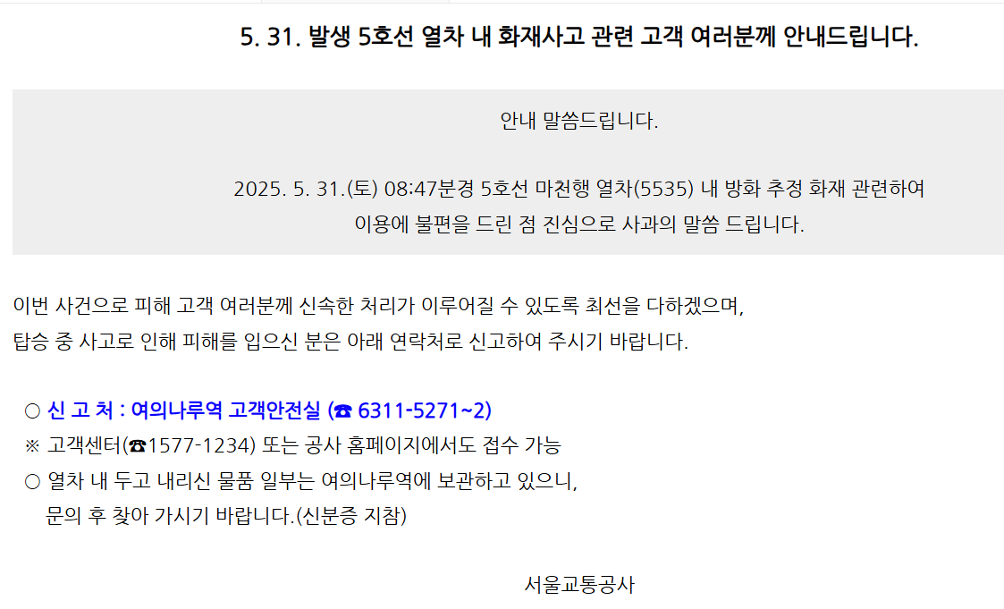 이번 서울 5호선 화재 사고는 “재난 대응에서 하드웨어(열차 내부)와 소프트웨어(훈련·시스템), 시민 의식까지 모두 중요하다”는 점을 다시 한 번 확인시켰습니다.