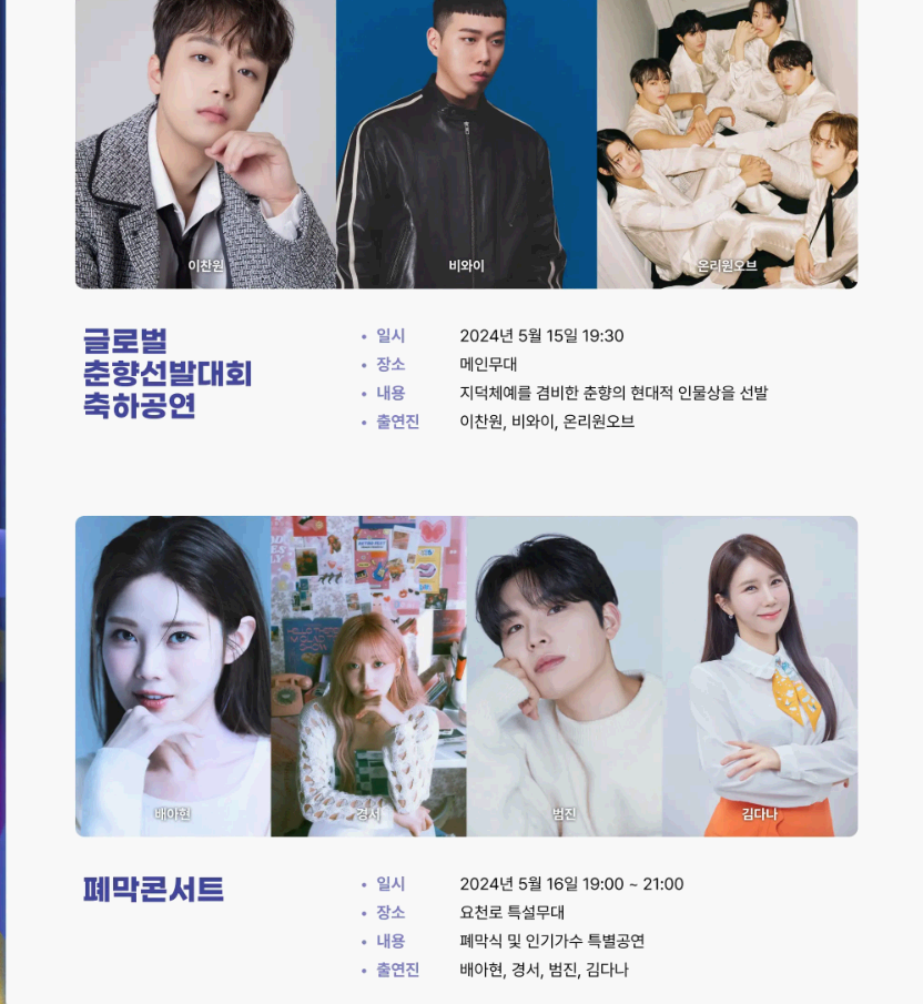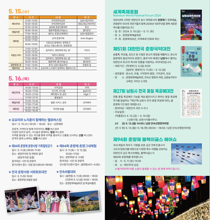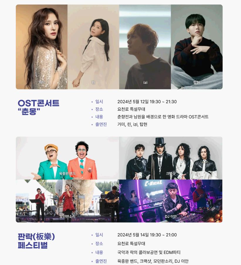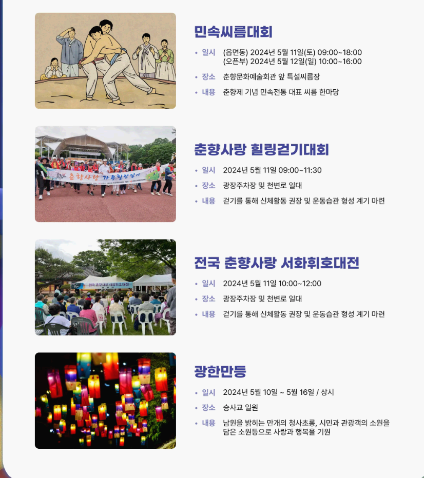 요요미와 노지훈이 함께하는 헬로버스킹, 춘향사랑 춘향제 가족힐링걷기, 춘향제 그네 체험, 민속씨름대회, 춘향제 블랙이글스 에어쇼등 다양한 행사와 공연 일정표 참고 하셔서 즐거운 축제를 즐기시기 바랍니다.