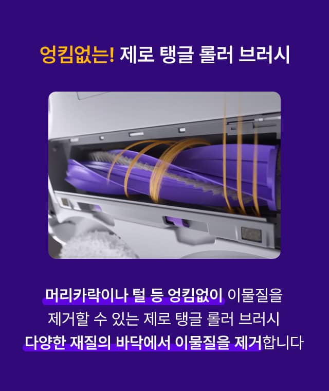 • 머리카락이나 털 등 엉킹없이 이물질을 제거할 수 있는 제로 탱글 롤러 브러시로 다양한 재질의 바닥에서도 이물질을 제거합니다