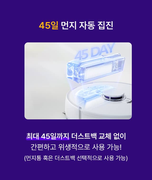 • 최대 45일 먼지 자동 집진- 더스트백 교체 없이 간편하고 위생적으로 사용 가능(먼지통 혹은 더스트백 선택적으로 사용 가능)