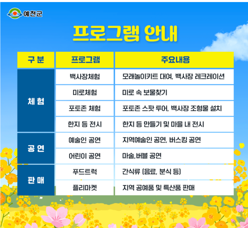예천 회룡포 봄꽃 축제 '예천 회룡포 봄꽃 축제' 유채꽃밭과 청보리밭으로 조성이 되어있어 축제기간 동안 자연의 아름다움을