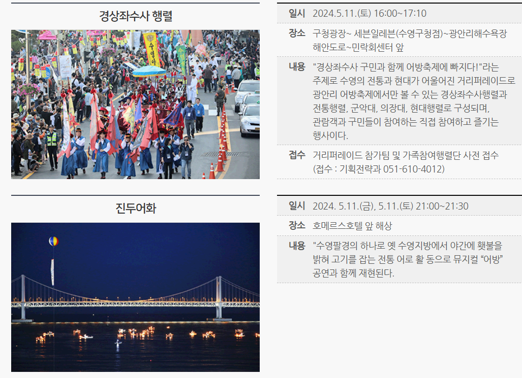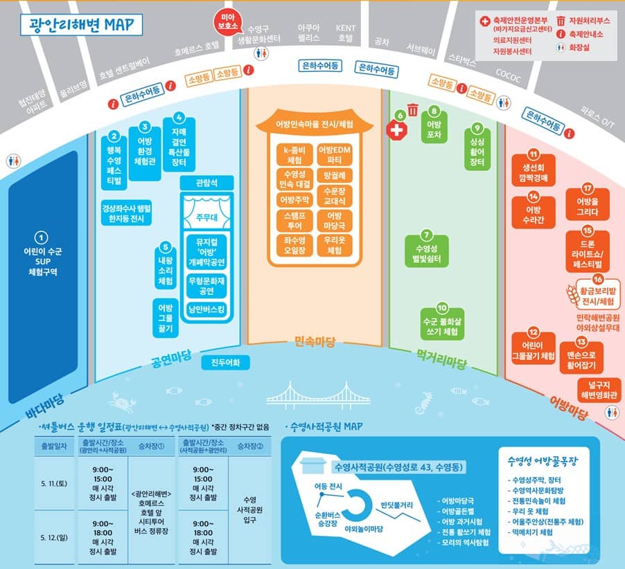 부산광역시 수영구 광안해변로 219 (광안동)• 무료(먹거리, 일부 체험프로그램 유료) 무료(먹거리, 일부 체험프로그램 유료)