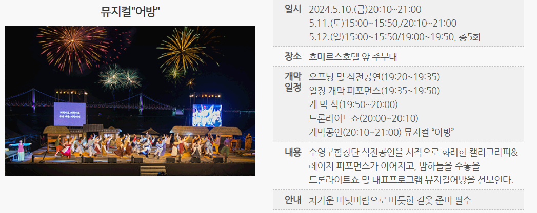 • 대표프로그램 : 뮤지컬 어방, 경상좌수사행렬 퍼레이드