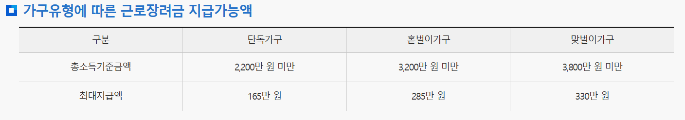 일은 하지만 소득이 적어 생활이 어려운 근로자, 사업자(전문직 제외) 가구에 대하여 가구원 구성과 근로소득, 사업소득 또는 종요인소득에 따라 산정된 근로장려금을 지급함으로써 근로를 장려, 실질 소득을 지원하는 근로연계형 소득지원제도입니다