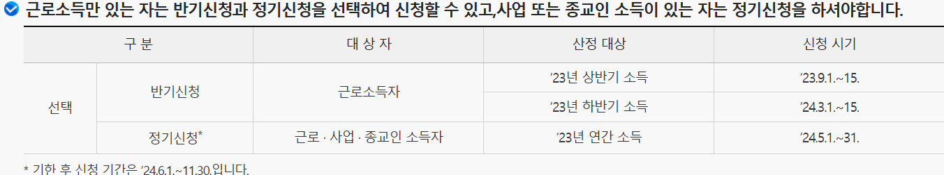 근로소득만 있으시면 반기신청 ( 신청 시기 23.09.01~ 15/ 24.03.01~ 15), 정기신청을 선택하여 신청할 수 있고,사업 또는 종교인 소득이 있으시면 정기신청 24. 05.01~ 05.31까지 하셔야 합니다.