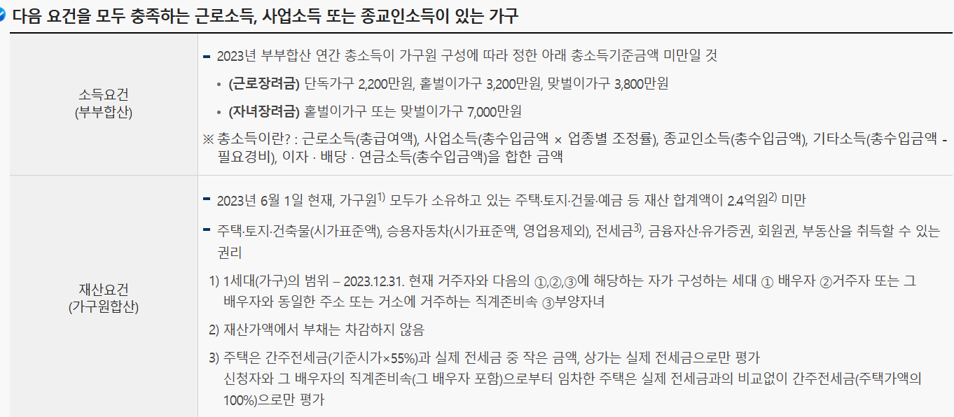 • 맞벌이 가구:거주자 및 배우자 각각의 “총 급여액 등”이 3백만 원 이상인 가구신청 자격