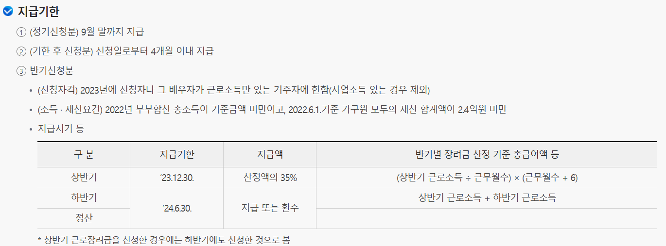 4. 2023.12.31. 현재 계속 근무하는 상용 근로자(일용근로자 제외)로서 월평균 근로소득이 500만 원 이상인 자(그 배우자를 포함)(근로장려금만 해당)신청기간