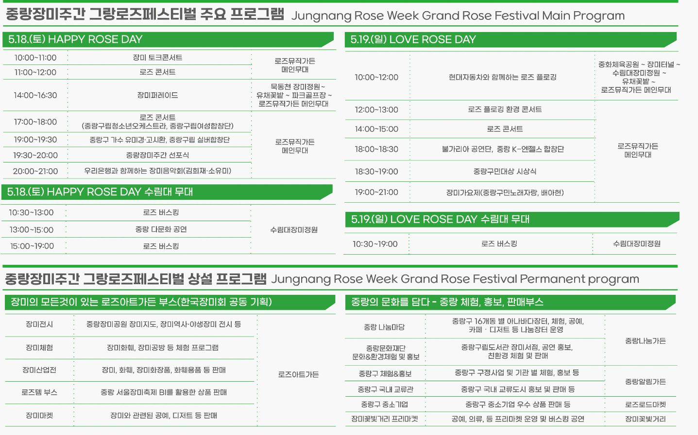 첫날인 18일에는 중랑구 주민들과 함께하는 장미퍼레이드를 시작으로 중랑 장미주간 선포식과 장미음악회가 열리며,