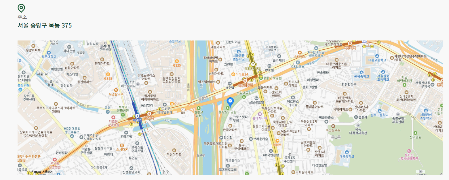 - 지하철 7호선 중화역 4번 출구 장미제일시장 방면 중랑천 방향 도보 10분