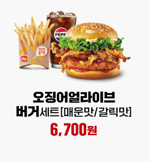 오징어얼라이브 버거 세트를 6,700원에 착한 가격에 점심메뉴로 즐기실 수 있습니다.