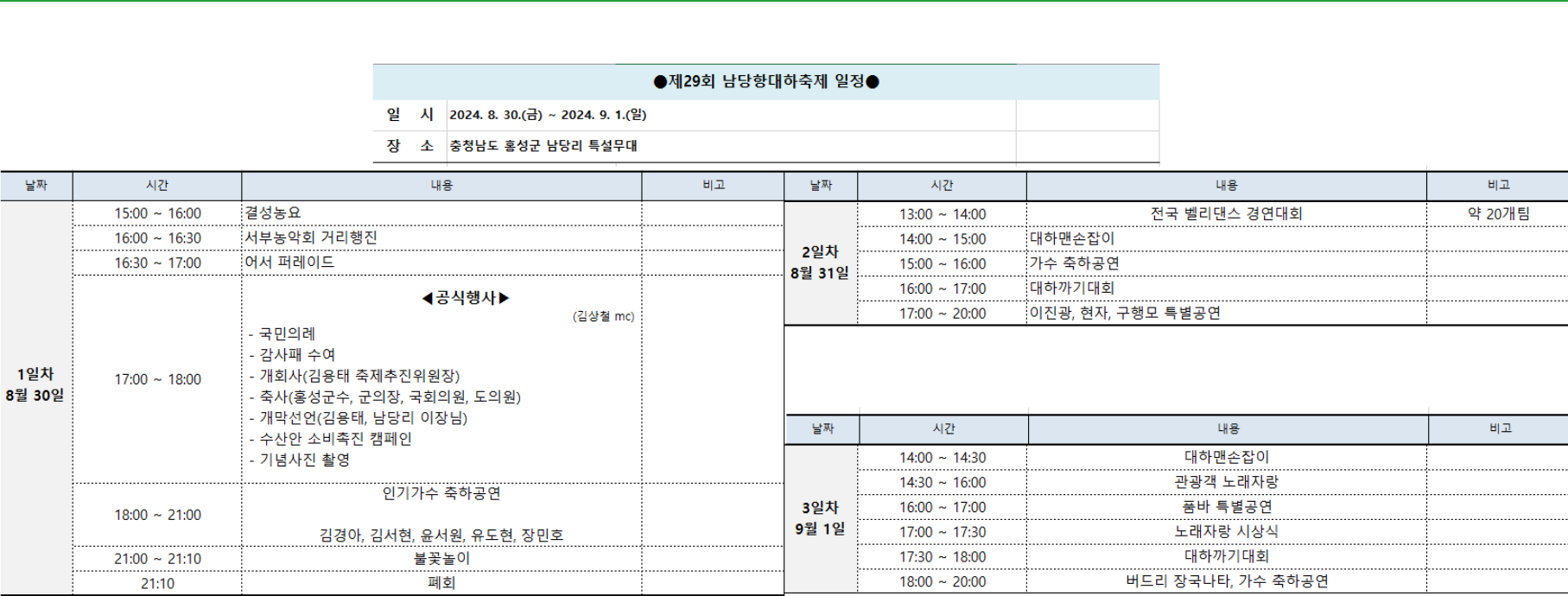 2. 공연프로그램 : 국내 정상급 가수(장민호, 류지광)들의 화려한 무대, 홍성문화공연, 관광객 노래자랑 등